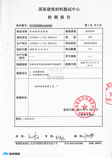 经过科学检验,力同抗菌彩涂铝卷对日常生活中的金黄葡萄球菌、大肠杆菌等18种病菌达到99.99% 的抗菌率。而且对一些顽固的霉菌也能起到很好的抗菌效果,比如黄曲霉、黑曲霉等致癌菌种。